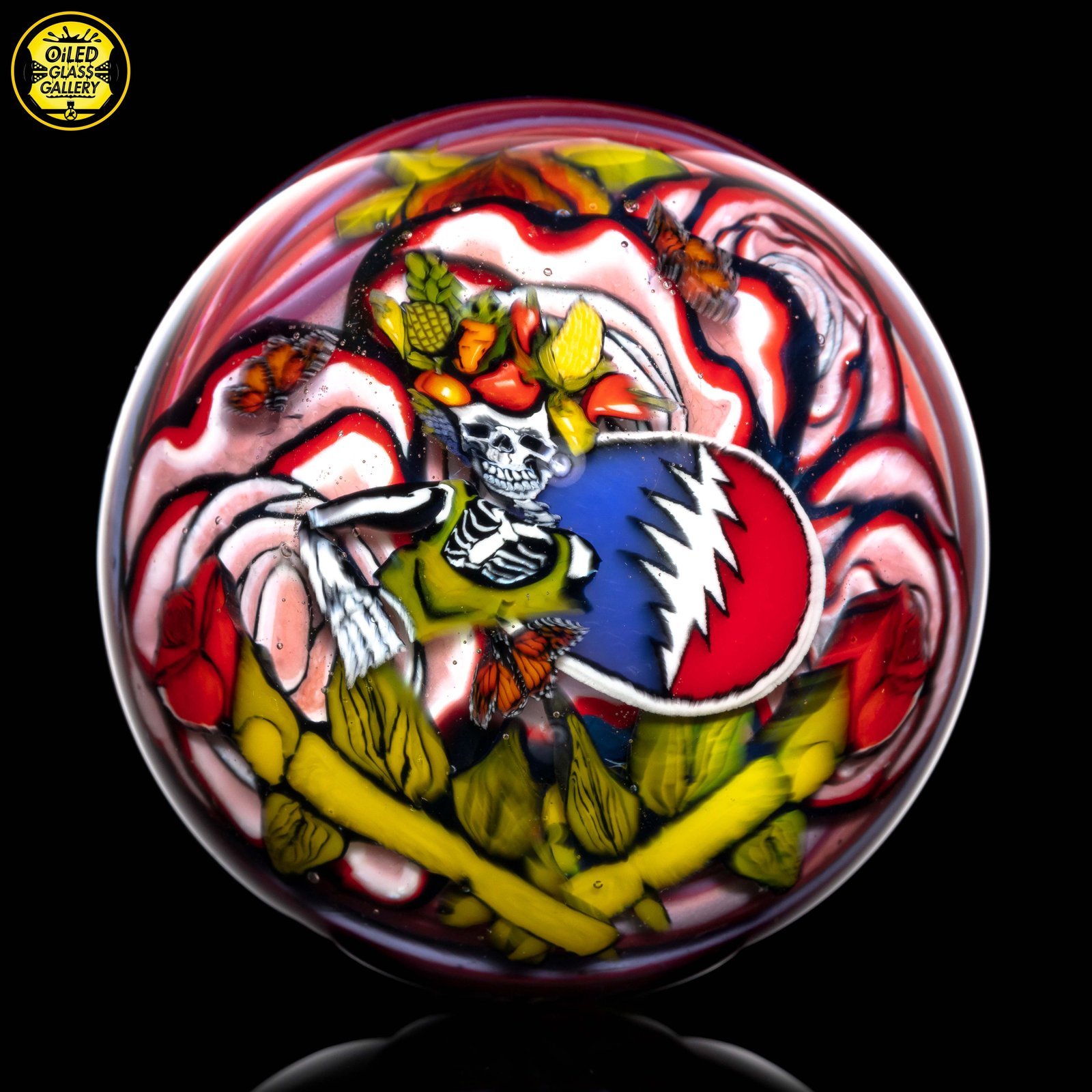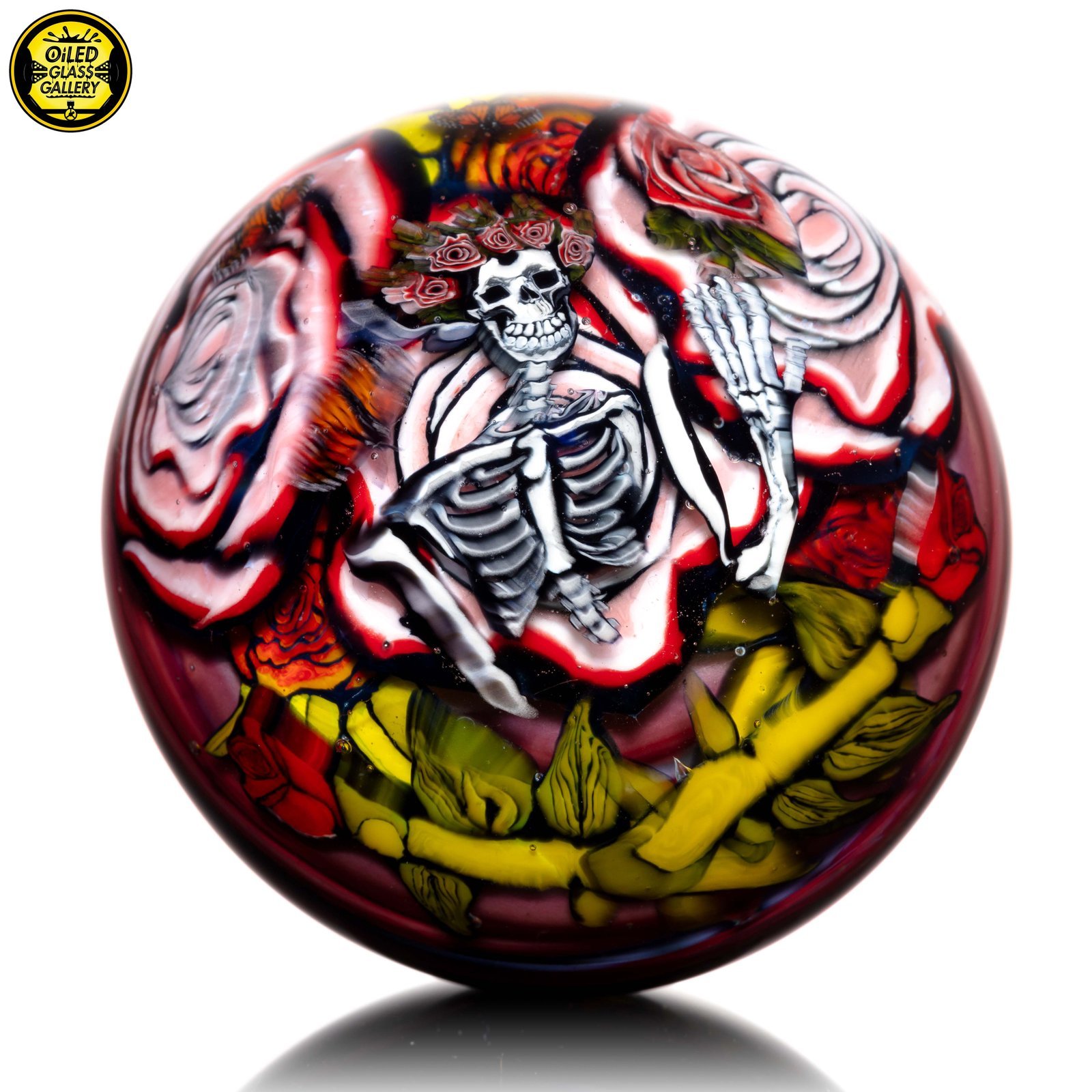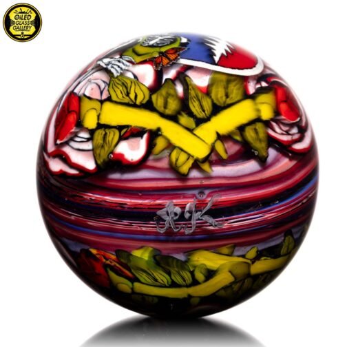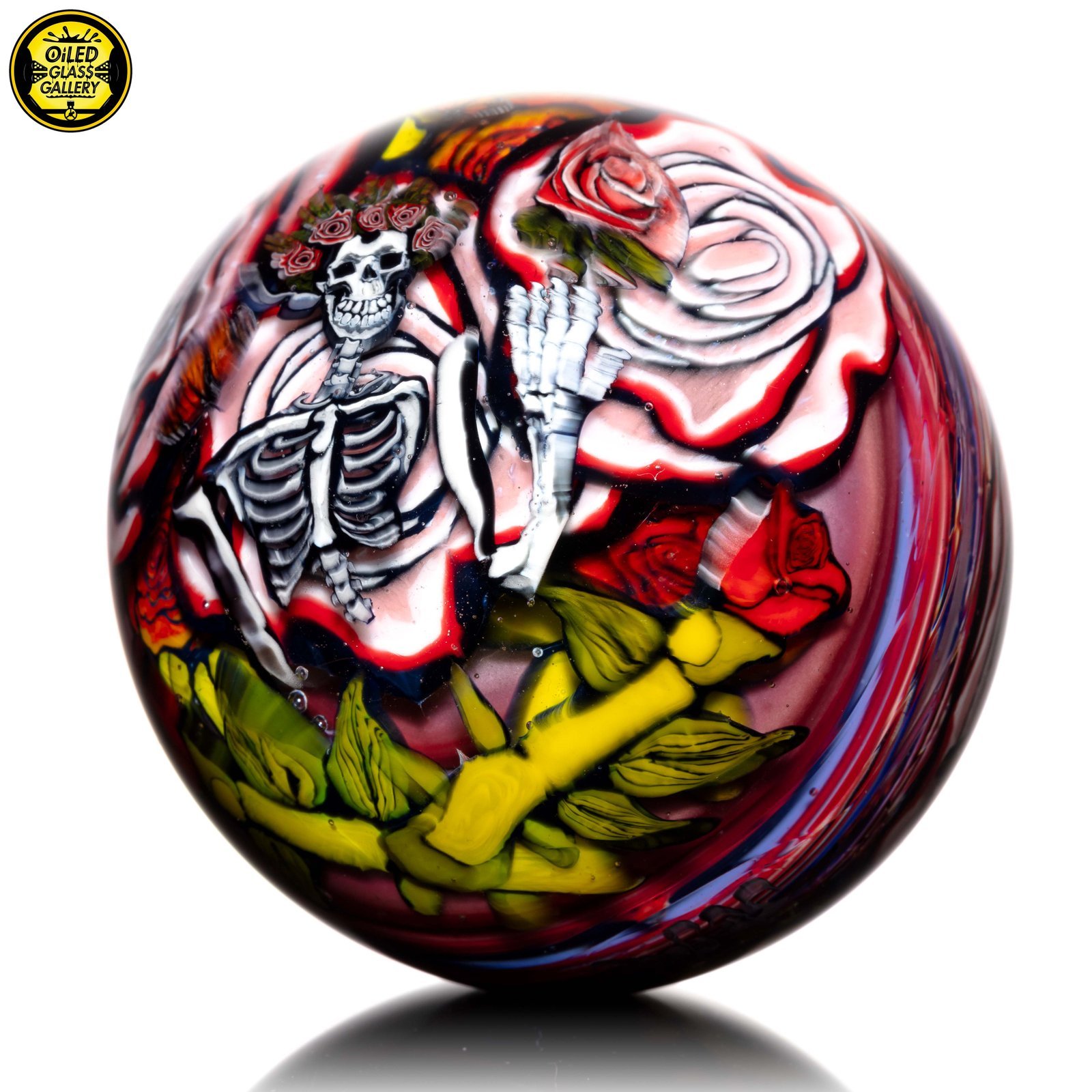 2023 68mm/2.7in UV Grateful Dead Double Bertha Rose Murrine Marble featuring a UV Bertha with Lightning Bolt murrine slab, another huge Bertha murrine slab, and Rose millefiori around the exterior.