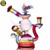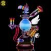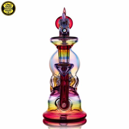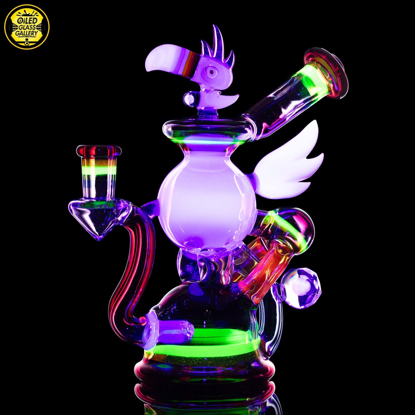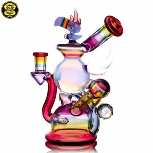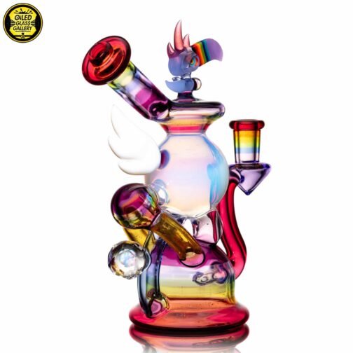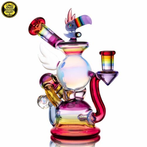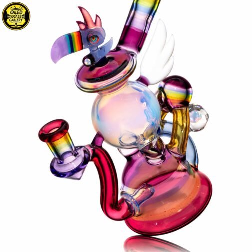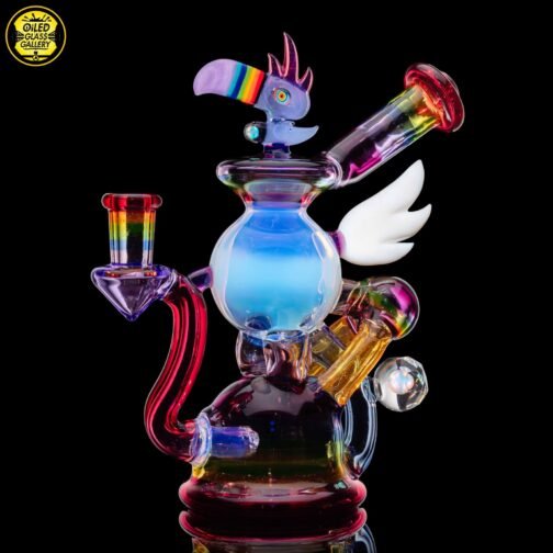 2023 10mm 6.25in UV Rainbow Toucan Blooper Dual Recycler made with a variety of colors, including UV. This piece features a 3-hole perk, a mounted sculpted toucan with opal on top, a mounted sculpted wing, a mounted faceted mib on the back with an encased opal sphere and comes shipped in a Yellow Pelican 1200 case.