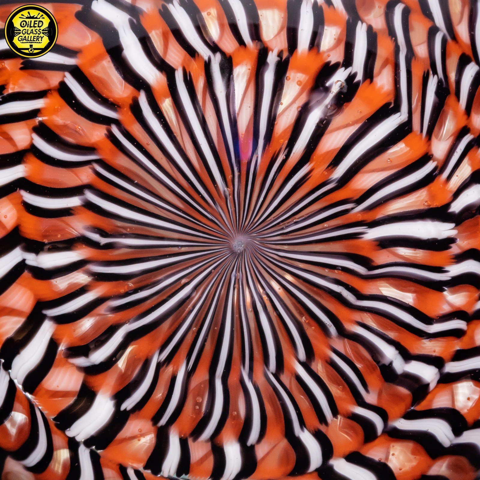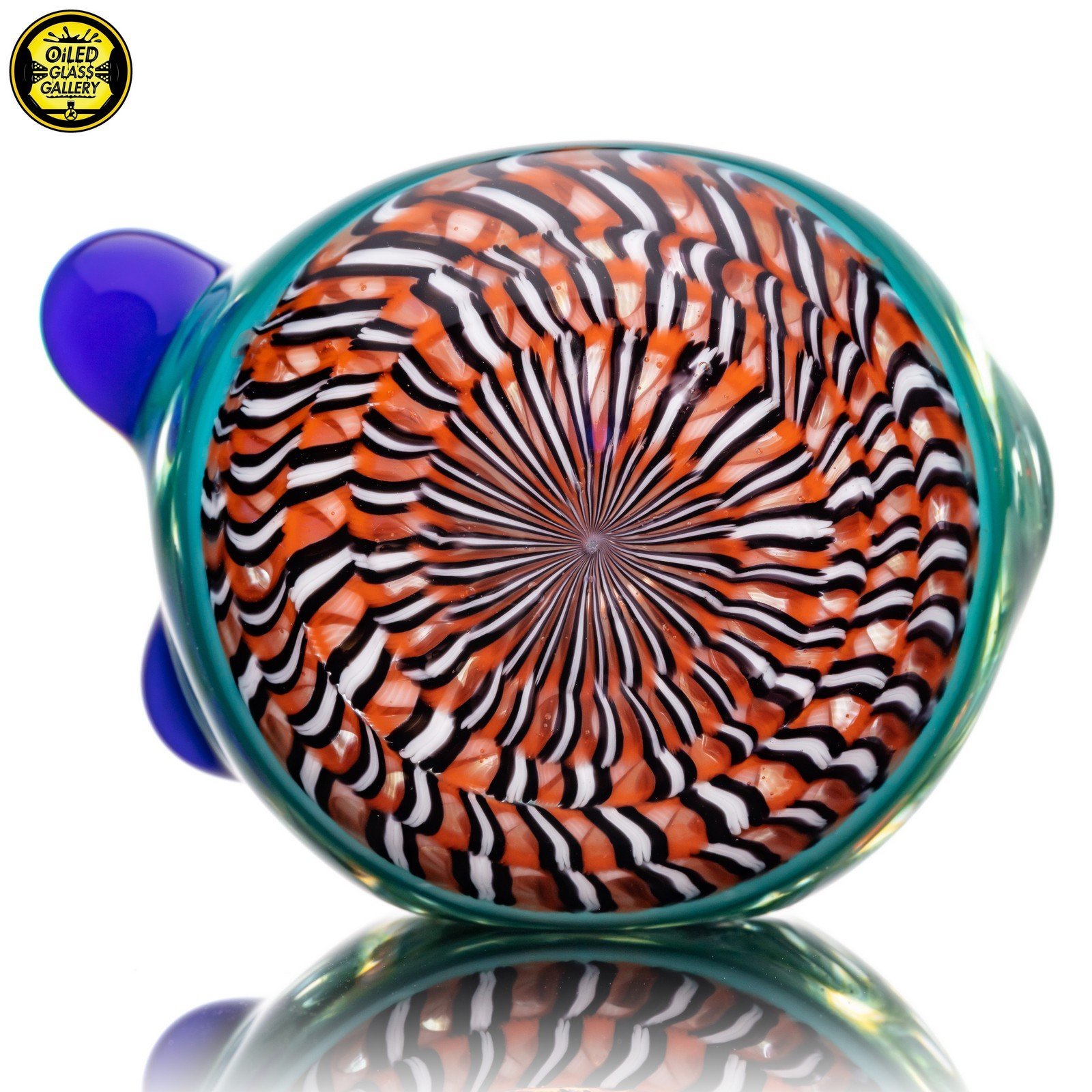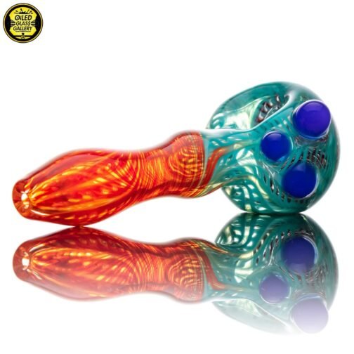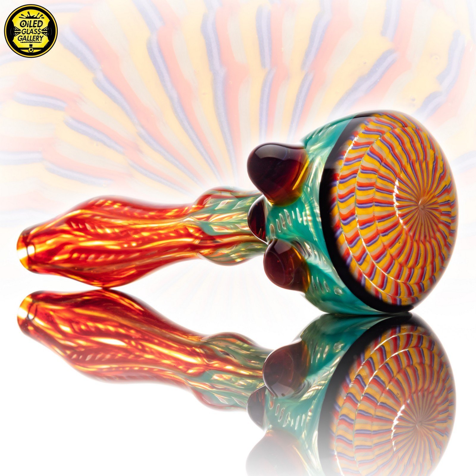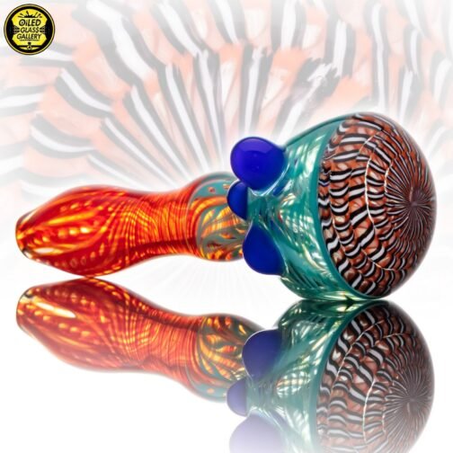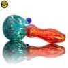 2021 4.75in Wrap and Rake Spoon pipe made of Glass Alchemy Persimmon Strike and Glass Alchemy Really Tealy with Gold fume featuring mibs on the side and a latticino front section.
