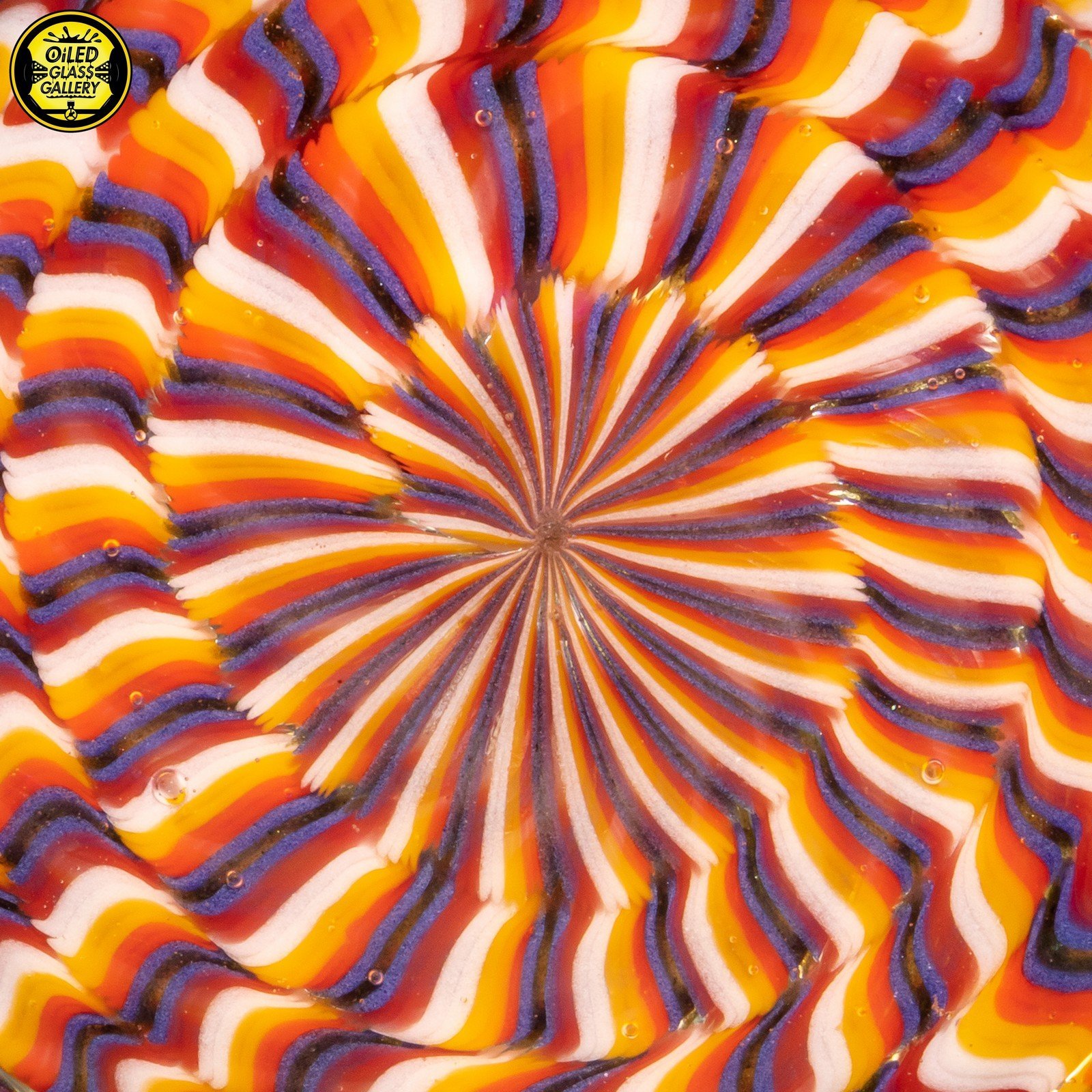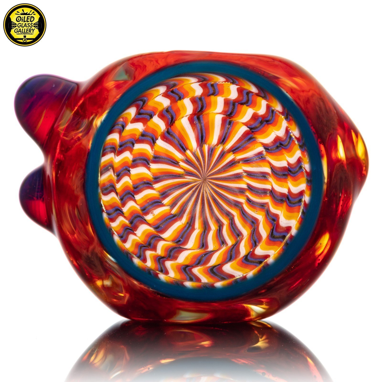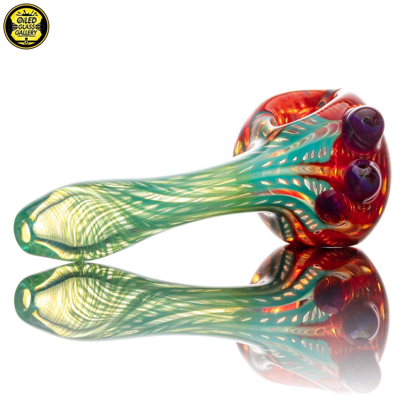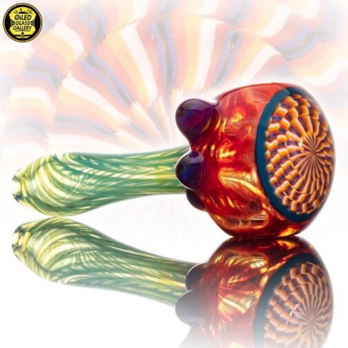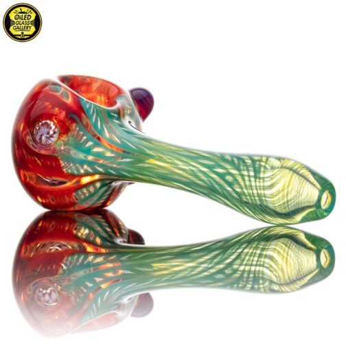 2021 4.75in Wrap and Rake Spoon pipe made of Glass Alchemy Persimmon Strike and Glass Alchemy Really Tealy with Gold fume featuring Northstar Glass Amber Purple mibs on the side and a latticino front section.