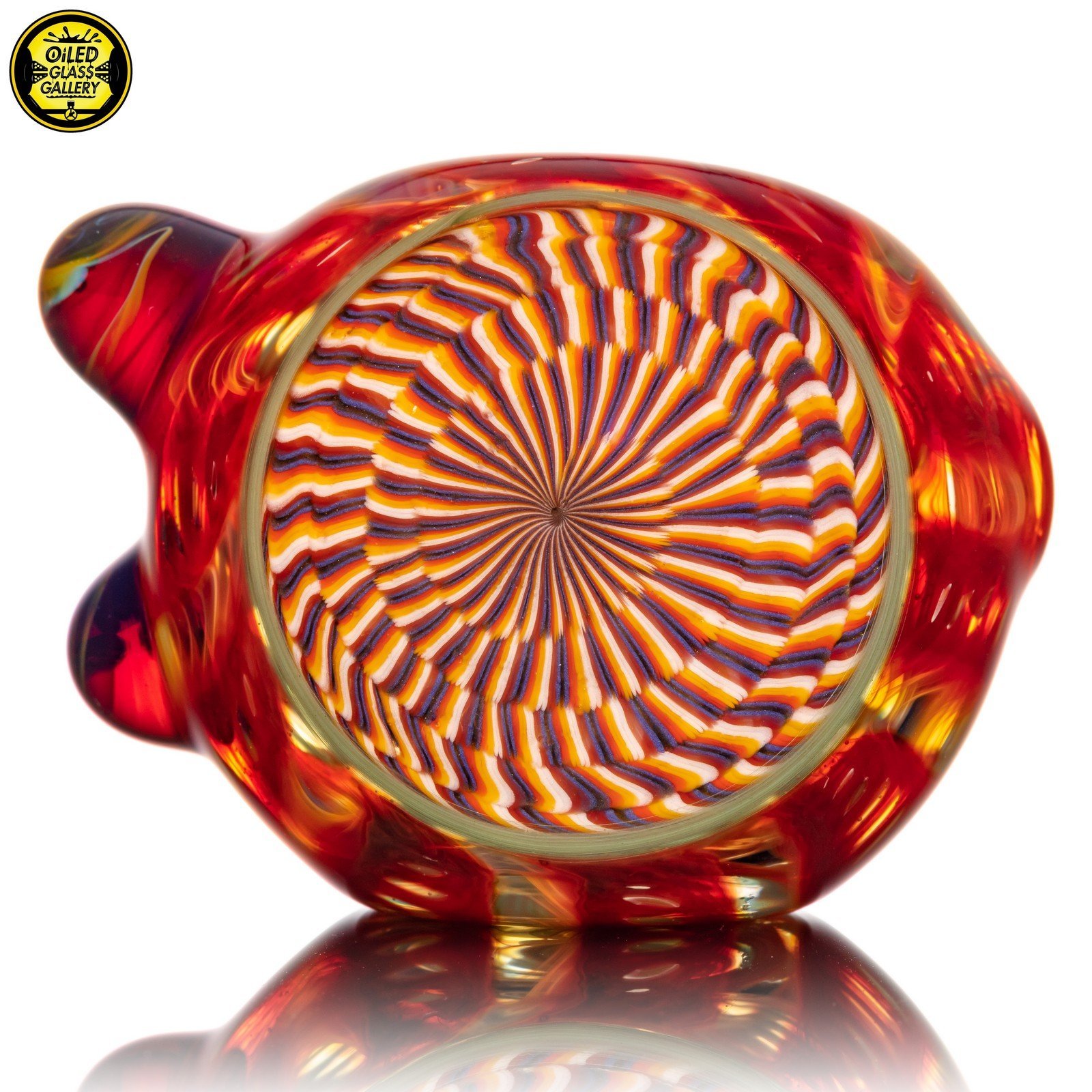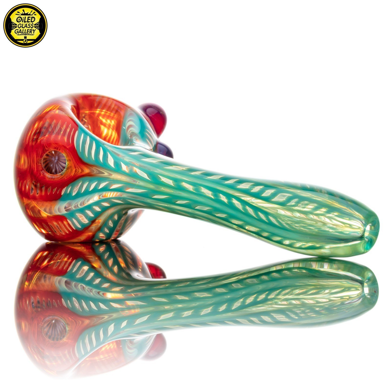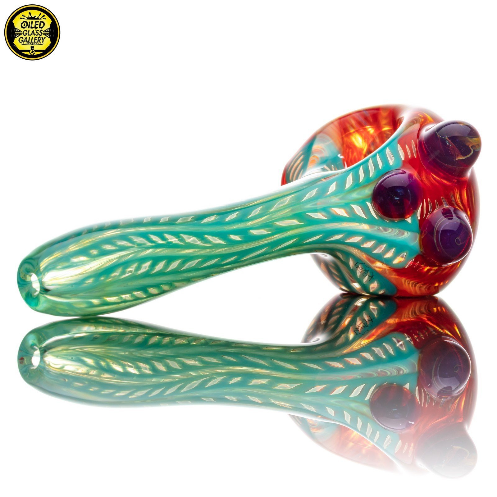 2021 4.5in Wrap and Rake Spoon pipe made of Glass Alchemy Persimmon Strike and Glass Alchemy Really Tealy with Gold fume featuring Northstar Glass Amber Purple mibs on the side and a latticino front section.