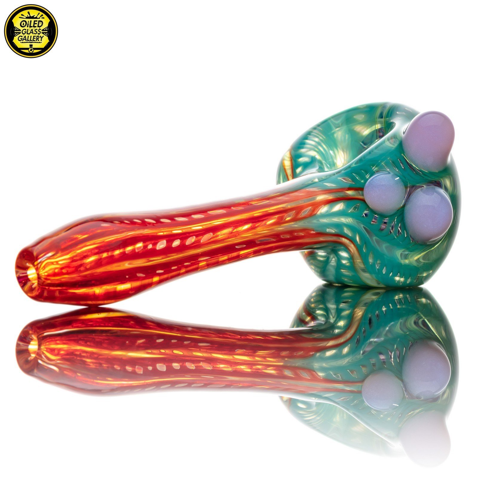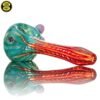 2021 4.75in Wrap and Rake Spoon pipe made of Glass Alchemy Persimmon Strike and Glass Alchemy Really Tealy with Gold fume featuring mibs on the side and a latticino front section.