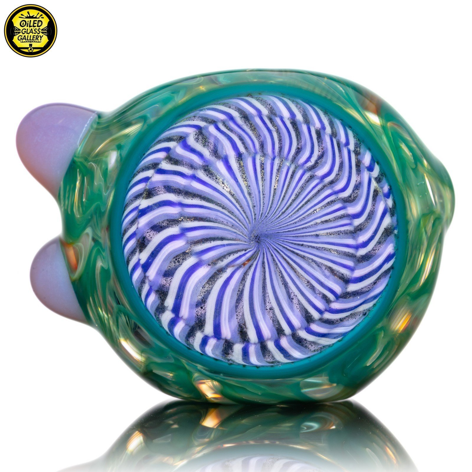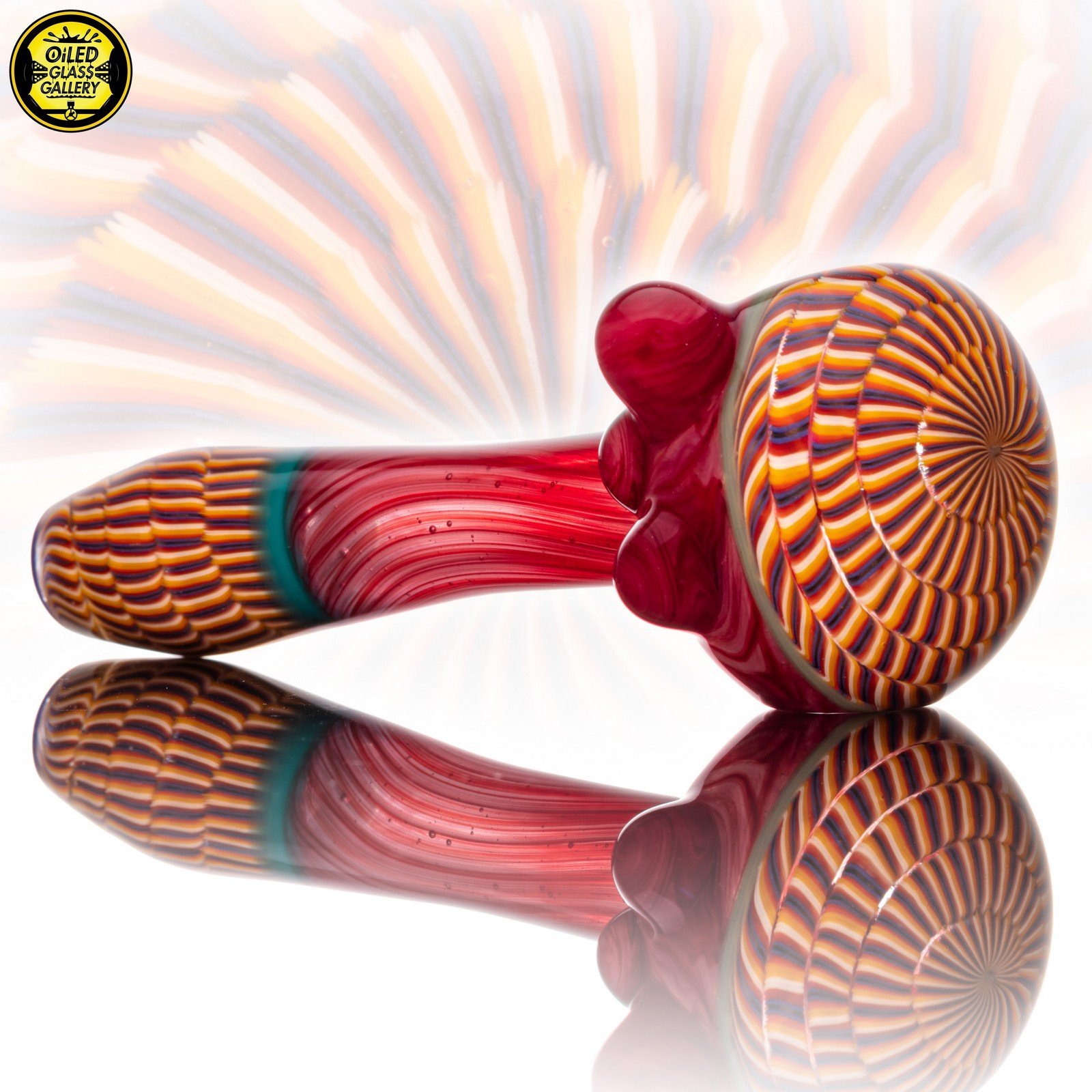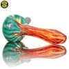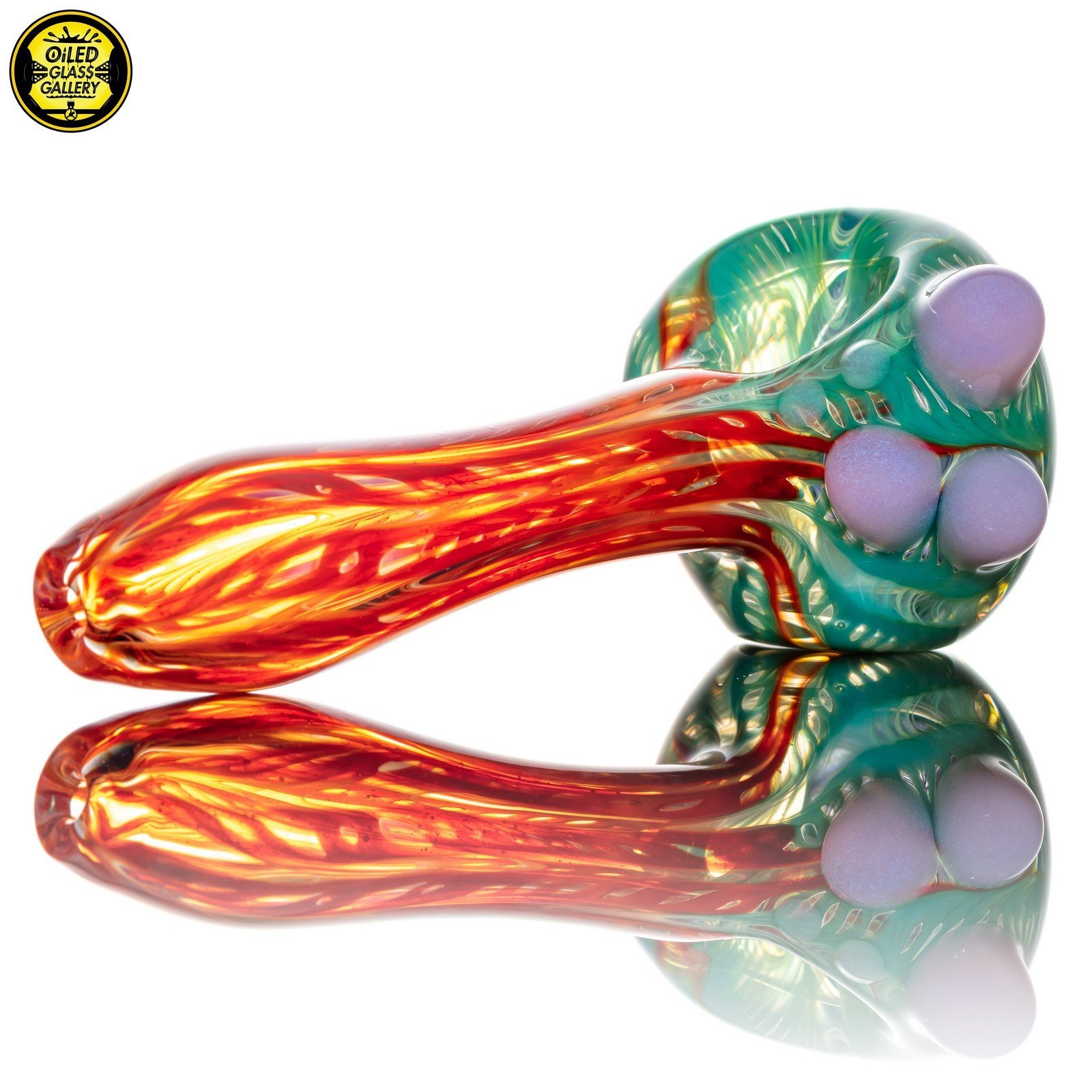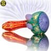 2021 4.25in Wrap and Rake Spoon pipe made of Glass Alchemy Persimmon Strike and Glass Alchemy Really Tealy with Gold fume featuring mibs on the side and a latticino front section.