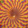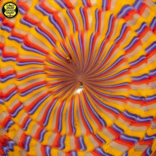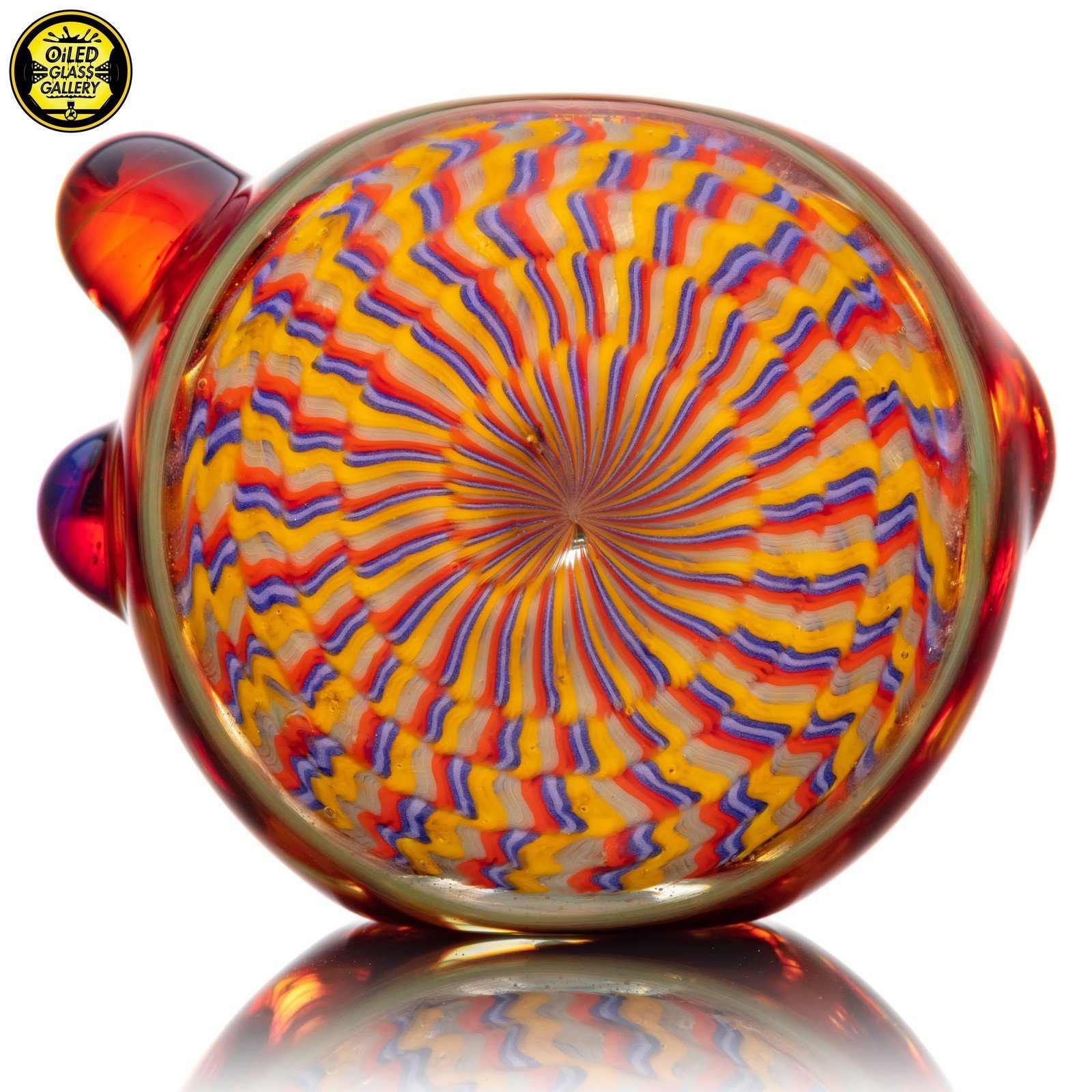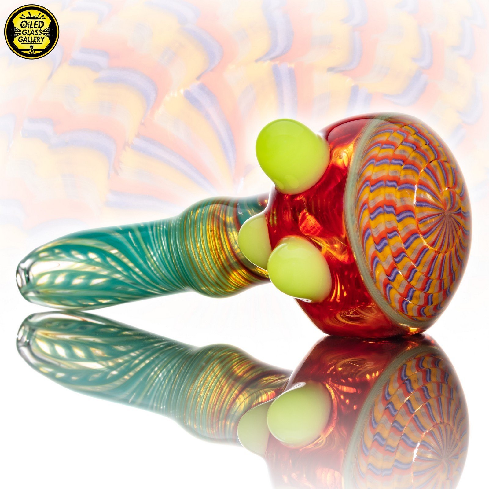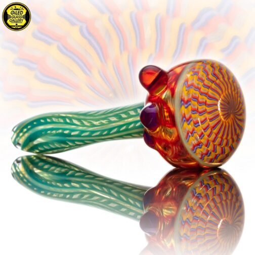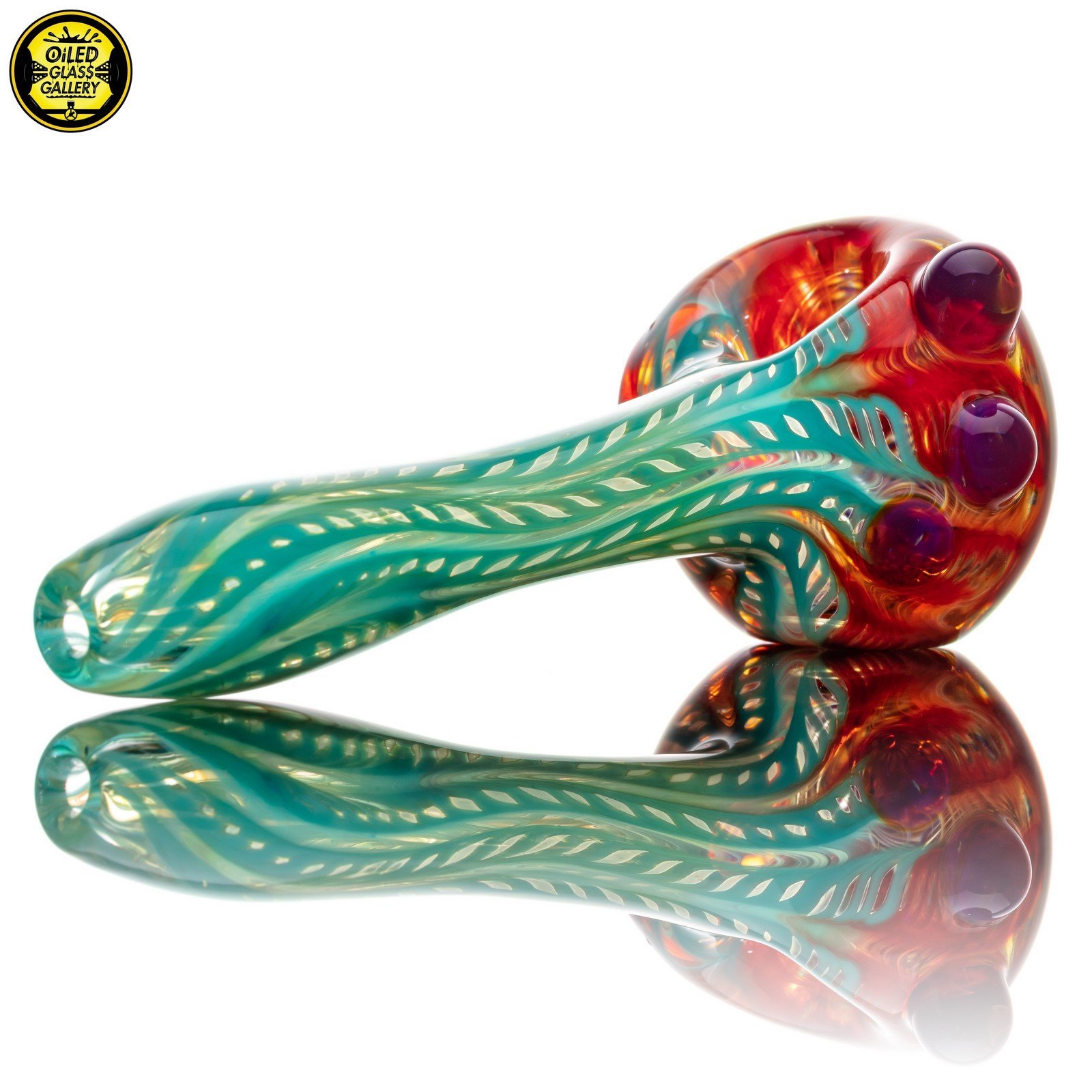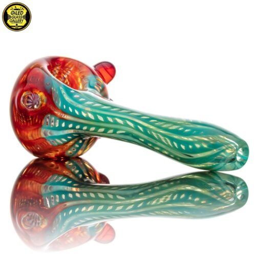 2021 5in Wrap and Rake Spoon pipe made of Glass Alchemy Persimmon Strike and Glass Alchemy Really Tealy with Gold fume featuring Northstar Glass Amber Purple mibs on the side and a latticino front section.