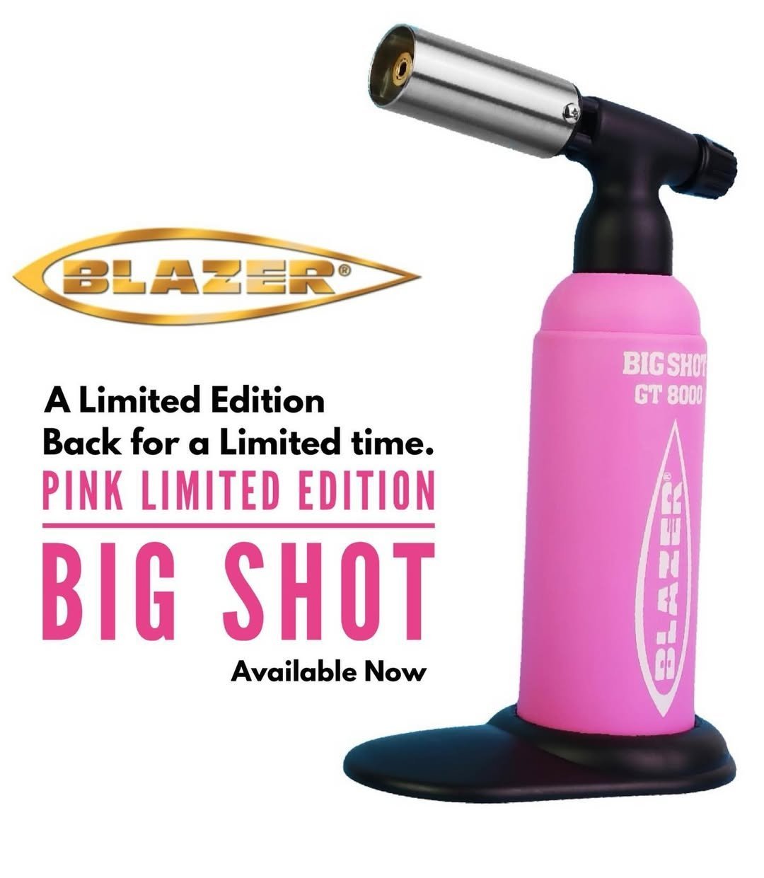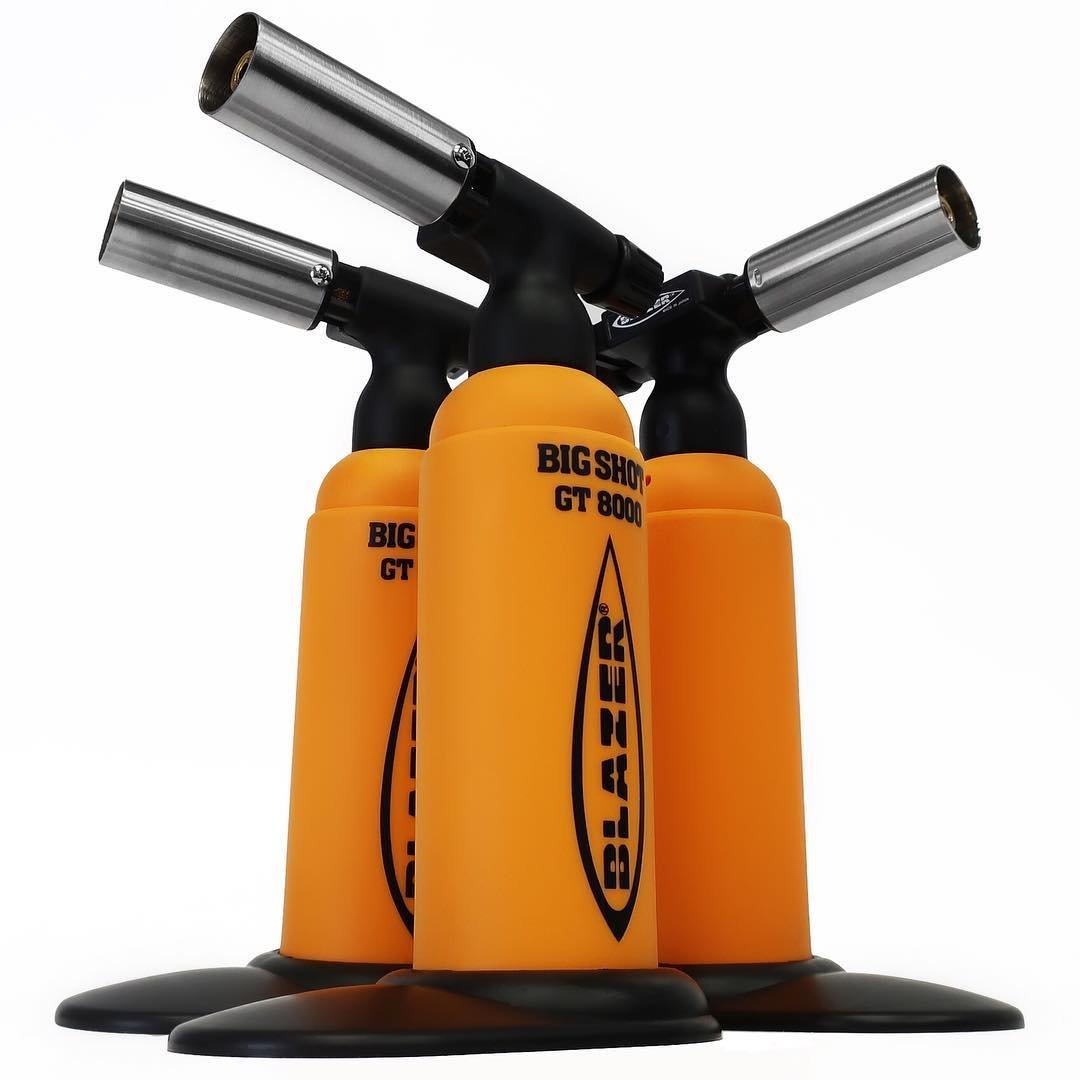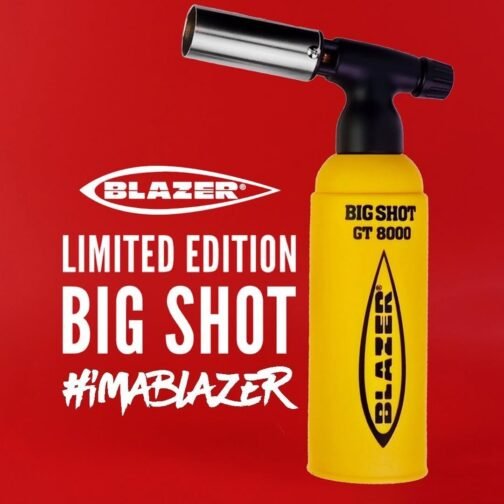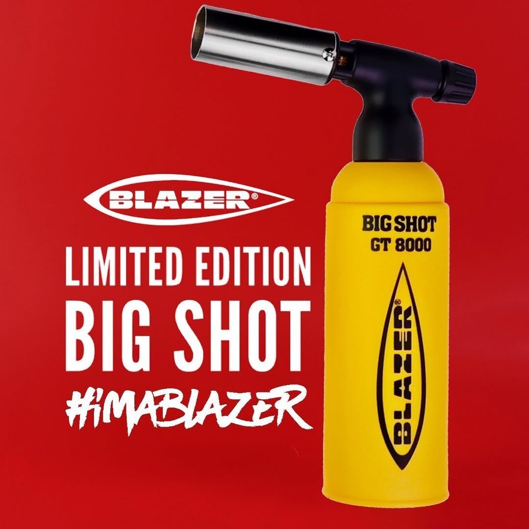 Yellow with Black Label Limited Edition Blazer Big Shot GT8000 Torch made in Japan featuring a stainless steel nozzle and are butane refillable.